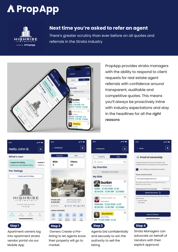 Agents waste time cold-calling to find motivated sellers. PropApp set out to create a transparent marketplace where homeowners post their property once and local agents compete to represent them.