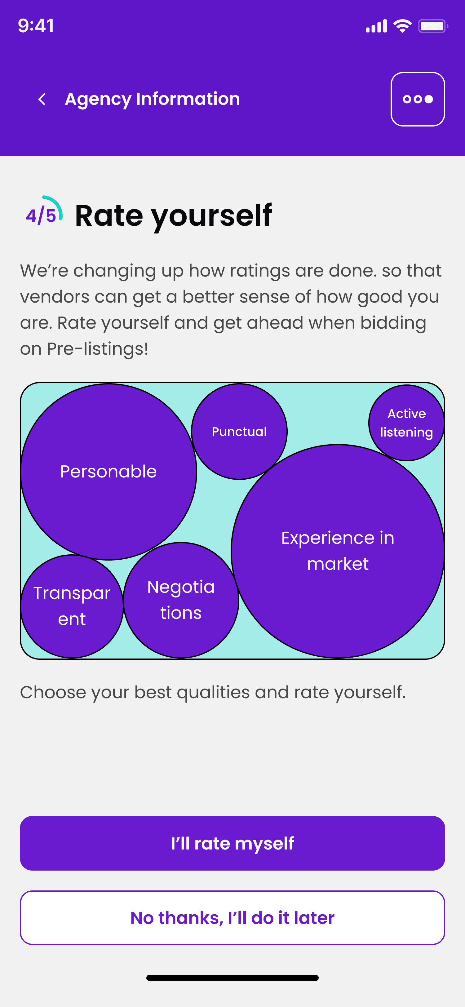 Create a transparent, two-sided marketplace where homeowners can post their property once and let qualified local agents compete to represent them. Giving homeowners greater visibility into the process of selling there home, giving them the information and control to choose the agent that is right for them, while providing motivated and leads to agents effectively reducing the need for cold calling