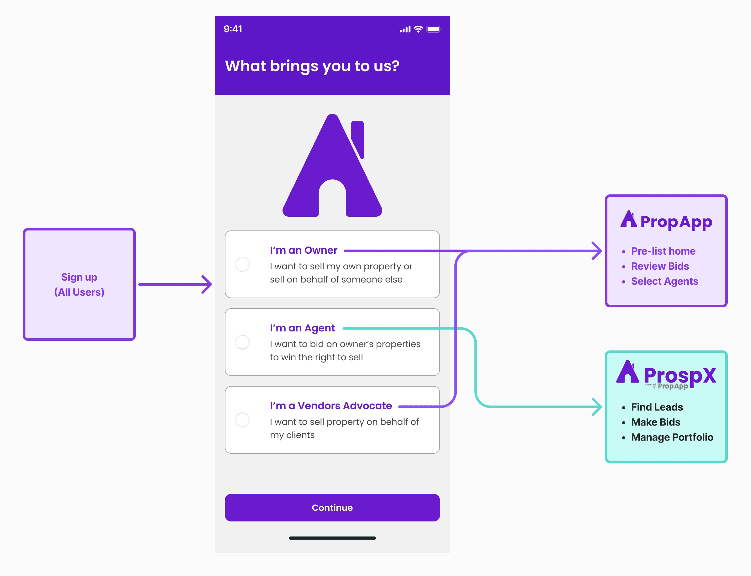 Split into PropApp (homeowners) and ProspX (agents) following successful two-sided marketplace patterns where buyers and providers use different apps.